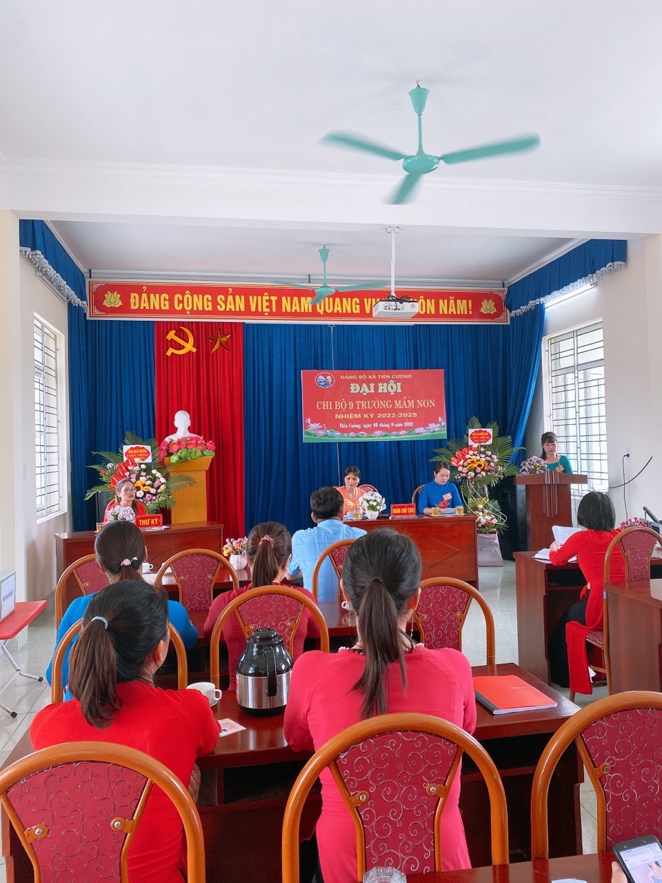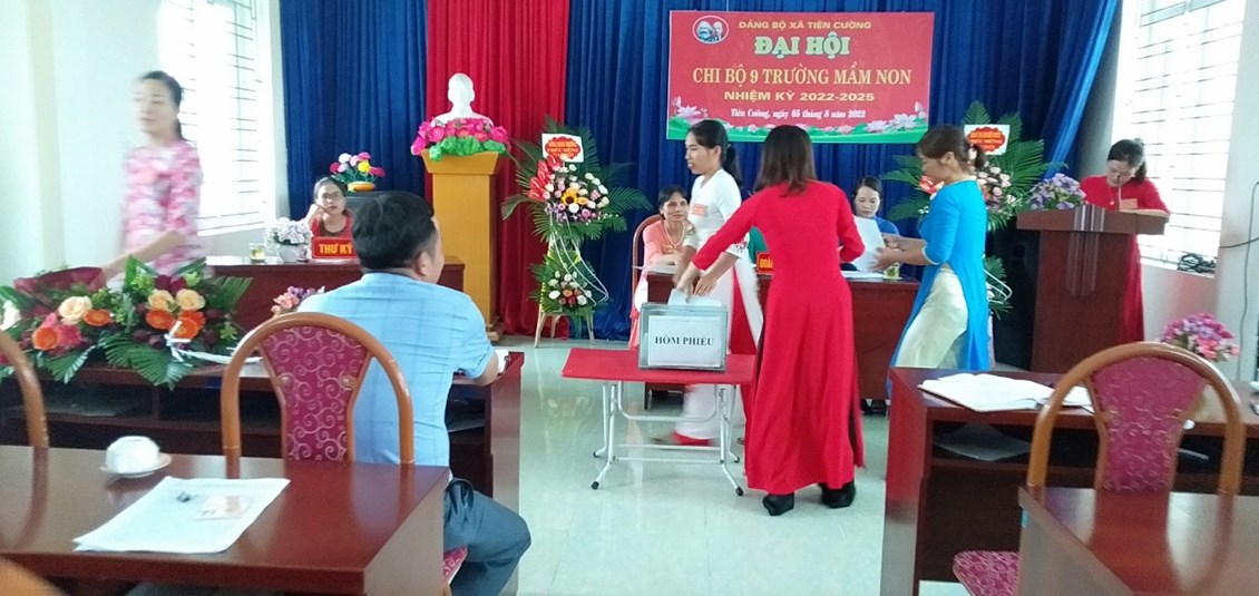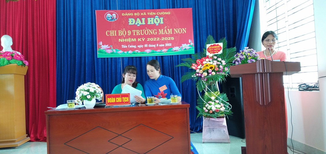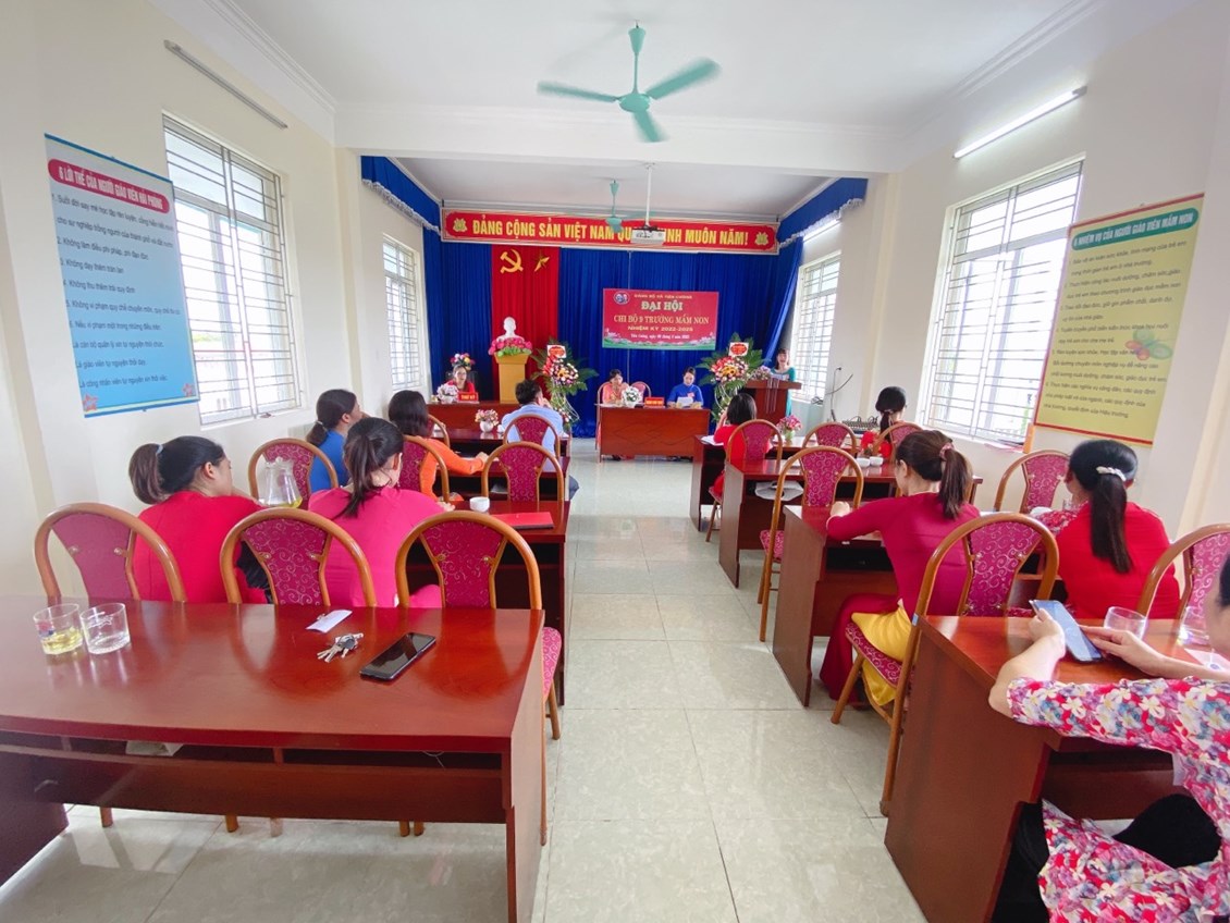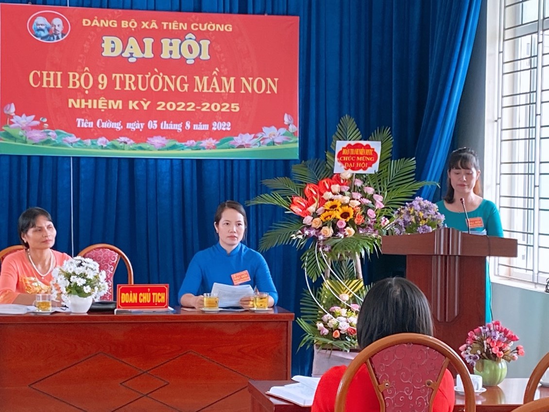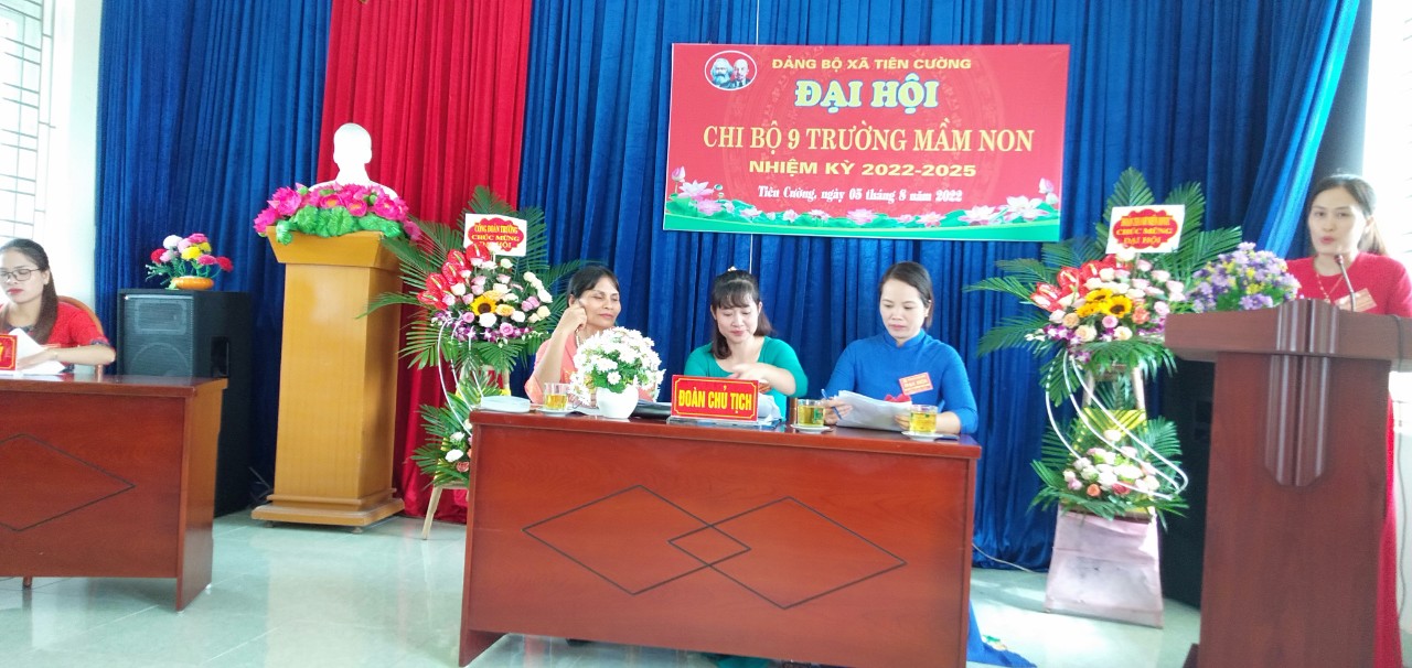 Trong không khic thi đua lập thành tích chào mừng ngày cách mạng tháng 8 và Quốc Khánh 2/9. Chiều ngày 5-8-2022 Chi bộ trường mầm non Tiên Cường long trọng tổ chức đại hội Chi bộ nhiệm kỳ 2022-2025. Về dự và chỉ đạo Đại hội có đồng chí Lê Văn Tỉnh - Phó bí thư thường trực Đảng uỷ xã Tiên Cường và 20/20 đảng viên trong chi bộ đã về dự đông đủ (17 đảng viên chính thức, 3 đảng viên dự bị). Đại hội đã báo cáo tổng kết nhiệm vụ nhiệm kỳ 2020-2022, chỉ ra phương hướng nhiệm vụ nhiệm kỳ 2022-2025. Đại hội đã bầu cấp uỷ chi bộ gồm 3 đồng chí có tên sau với số phiếu tuyêt đối (17/17 phiếu):