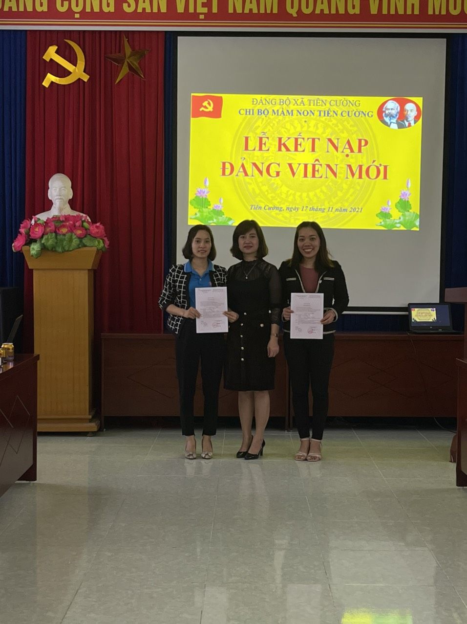 Ngày 17 tháng 11 năm 2021 Chi bộ trường Mầm non Tiên Cường đã trang trọng tổ chức buổi lễ Kết nạp đảng viên mới cho 2 đồng chí Hoàng Thị Mùi và Hoàng Thị Vân Chi. Cả hai đồng chí đã đọc lời tuyên thệ trước cờ Đảng và sự chứng kiến của tất cả Đảng viên trong chi bộ. Đ/c Phạm Thị Huyền- Bí thư Chi bộ đã phát biểu giao nhiệm vụ cho 2 đ/c đảng viên mới và giao nhiệm vụ theo dõi giúp đỡ cho 2 đ/c trong thời gian tới. Thay mặt Chi bộ chúc 2đ/c luôn vững vàng lập trường tư tưởng chính trị phấn đẫu nỗ lực không ngừng để hoàn thiện bản thân, sống cống hiến hết mình cho sự nghiệp ươm những mầm xanh tương lai cho đất nước, góp phần vào những thắng lợi thành tích chung của nhà trường. Một lần nữa xin được chúc mừng 2đ/c, chúc mừng Chi bộ ta có những cánh tay nối dài, cố gắng phát huy sức mạnh khối đại đoàn kết.