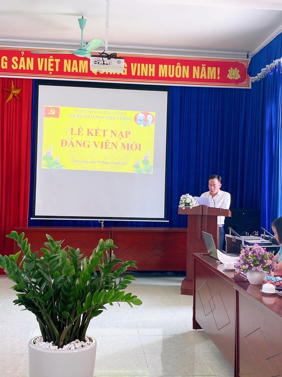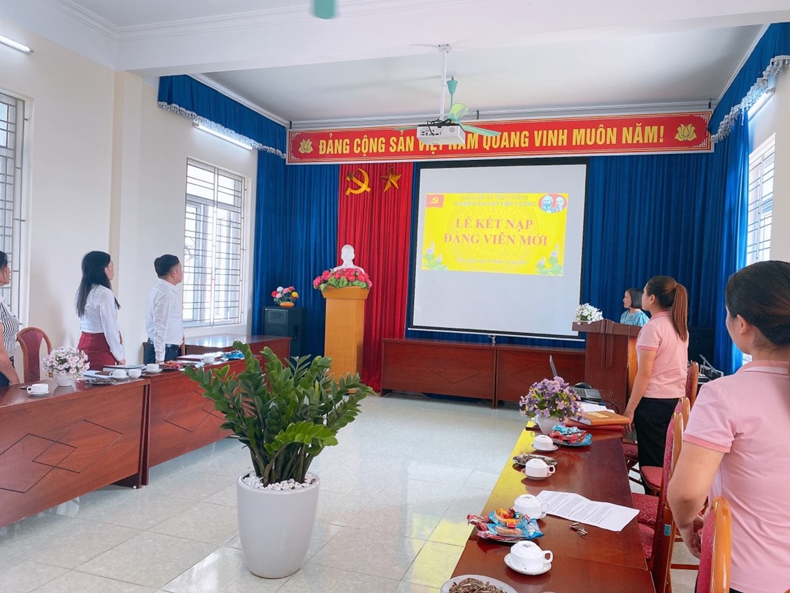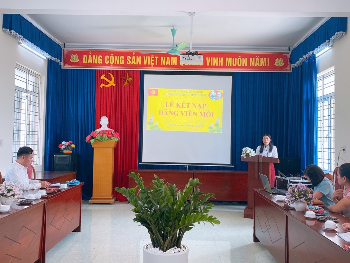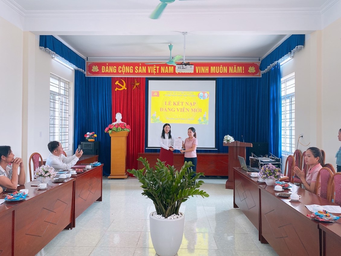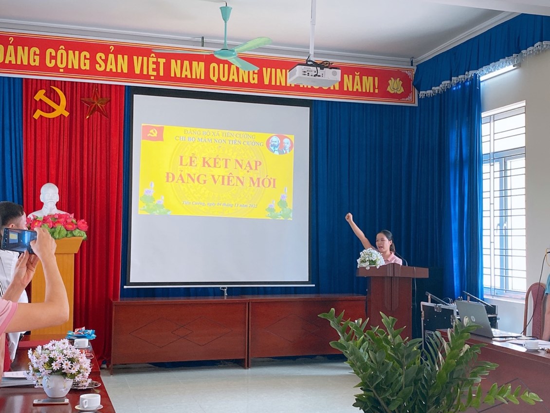 Ngày 04 tháng 11 năm 2022 thừa uỷ quyền của Huyện uỷ Tiên Lãng, đảng uỷ xã Tiên Cường, Chi bộ trường Mầm non Tiên Cường đã trang trọng tổ chức buổi lễ Kết nạp đảng viên mới cho đồng chí Phạm Thị Huế. Về dự với buổi lễ kết nạp Chi bộ vinh dự được đón đồng chí Lê Văn Tỉnh-Phó Bí thư thường trực Đảng uỷ xã Tiên Cường và tất cả đảng viên trong chi bộ. Tại buổi kết nạp đồng chí Vũ Thị Xuyếnđãtrao quyết định kết nạp cho đồng chi Phạm Thị Huế. Đồng chí Phạm Thị Huế vô cùng xúc động vì từ hôm nay đã được đứng trong hành ngũ của Đảng, trước sự chứng kiến của tất cả Đảng viên trong chi bộ đồng chí đã đọc lời tuyên thệ trước cờ Đảng. Đồng chí Vũ Thị Xuyến - Bí thư Chi bộ đã phát biểu giao nhiệm vụ cho 2 đ/c đảng viên mới và giao nhiệm vụ theo dõi giúp đỡ cho đ/c trong thời gian tới. Thay mặt Chi bộ chúc đ/c luôn vững vàng lập trường tư tưởng chính trị phấn đẫu nỗ lực không ngừng để hoàn thiện bản thân, sống cống hiến hết mình cho sự nghiệp ươm những mầm xanh tương lai cho đất nước, góp phần vào những thắng lợi thành tích chung của nhà trường. Một lần nữa xin được chúc mừngđ/c, chúc mừng Chi bộ ta có những cánh tay nối dài, cố gắng phát huy sức mạnh khối đại đoàn kết.
