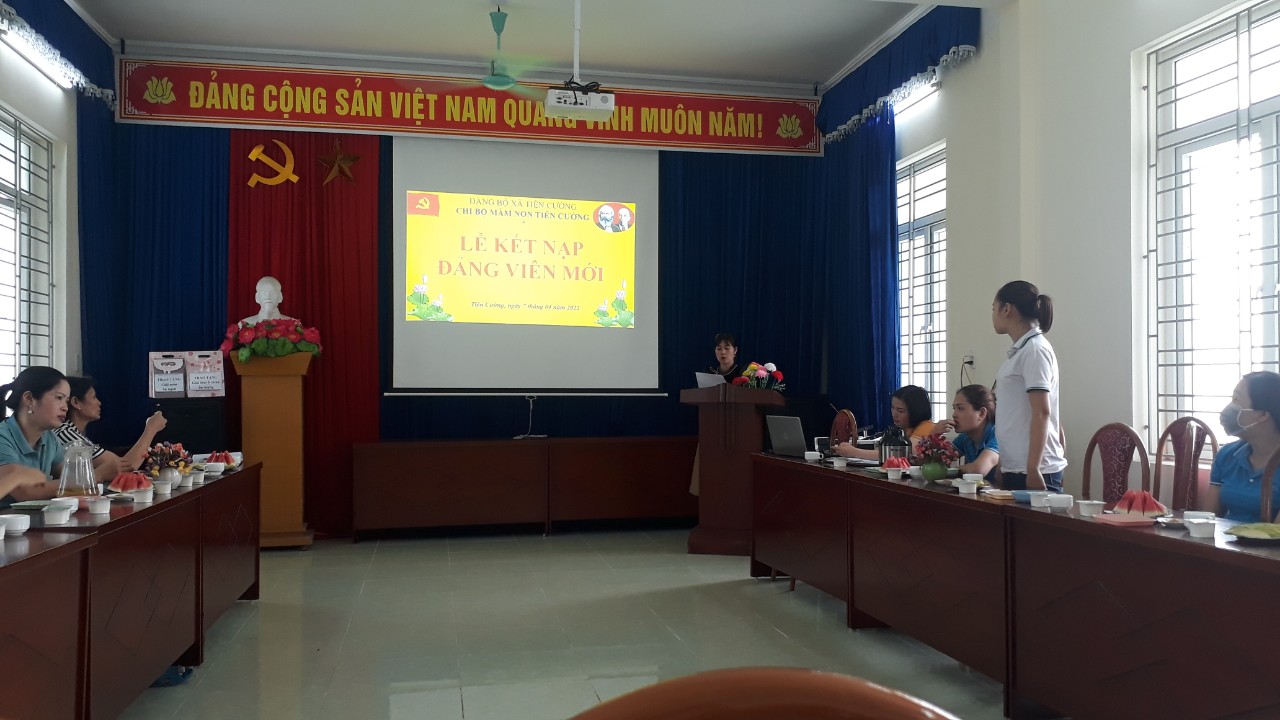 Chiều ngày 7 tháng 4 năm 2022 Chi bộ trường Mầm non Tiên Cường đã trang trọng tổ chức buổi lễ Kết nạp đảng viên mới cho Nguyễn Thị Nghĩa. Đồng chí đã đọc lời tuyên thệ trước cờ Đảng và sự chứng kiến của tất cả Đảng viên trong chi bộ. Đ/c Phạm Thị Huyền- Bí thư Chi bộ đã phát biểu giao nhiệm vụ cho đ/c đảng viên mới và giao nhiệm vụ theo dõi giúp đỡ cho đ/c trong thời gian tới. Thay mặt Chi bộ chúc đ/c luôn vững vàng lập trường tư tưởng chính trị phấn đẫu nỗ lực không ngừng để hoàn thiện bản thân, sống cống hiến hết mình cho sự nghiệp ươm những mầm xanh tương lai cho đất nước, góp phần vào những thắng lợi thành tích chung của nhà trường. Một lần nữa xin được chúc mừng đ/c, chúc mừng Chi bộ ta có những cánh tay nối dài, cố gắng phát huy sức mạnh khối đại đoàn kết.