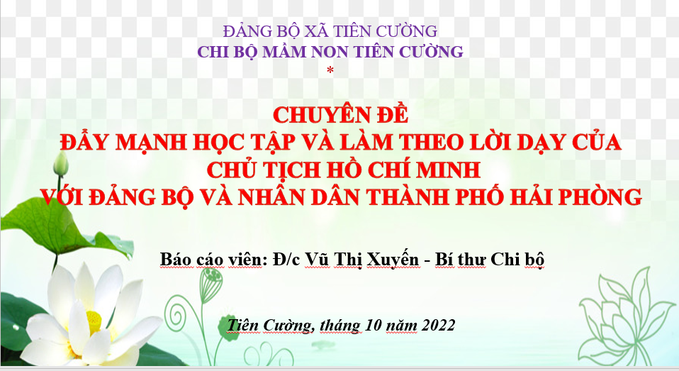 Ngày 06/10/2022 Chi bộ Trường Mầm non Tiên Cường đã tổ chức sinh hoạt Chi bộ thường kì tháng 10 và tổ chức đợt sinh hoạt chuyên đề với chủ đề : “Đẩy mạnh học tập và làm theo lời dạy của chủ tịch Hồ Chí Minh với Đảng bộ và nhân dân thành phố Hải Phòng”. Đồng chí Vũ Thị Xuyến- Bí thư Chi bộ - Hiệu trưởng nhà trường chủ trì Hội nghị cùng với sự có mặt đầy đủ của 20 đồng chí đảng viên trong chi bộ.