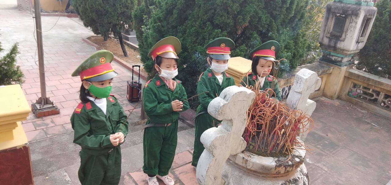 Nhân dịp kỉ niệm ngày thành lập Quân đội Nhân dân Việt Nam. Sáng ngày 22/12/2021, tất cả các bé tại các lớp đã tham gia các bài đồng diễn, trò chơi tại lớp vì lí do dịch bệnh. Riêng khối 5 tuổi tham gia Lễ chào cờ kỉ niệm, tham gia bài tập đồng diễn "Tập làm chú bộ đội, Chú bộ đội đảo xa". Sau hoạt động đó cô và các bé đến thăm địa chỉ đỏ là Nghĩa trang Liệt sĩ của xã. Tại đây các bé đã làm lễ chào cờ đầy trang nghiêm, thắp hương cho tất cả các phần mộ của các chú bộ đội đã hy sinh để bảo vệ cho Tổ Quốc. Cô và trò nhà trường tri ân sâu sắc công lao to lớn của các chú Bộ đội đã nằm xuống để bảo vệ hoà bình cho đất nước. Kính chúc các chú Bộ đội trên mọi miền của Tổ Quốc thật nhiều sức khoẻ, canh giữ biển trời Tổ Quốc mang lại bình yên cho các cháu mỗi ngày được tung tăng tới trường..