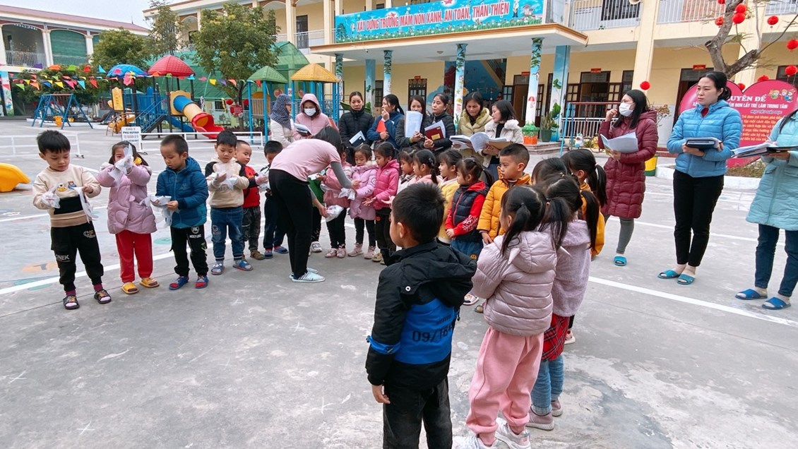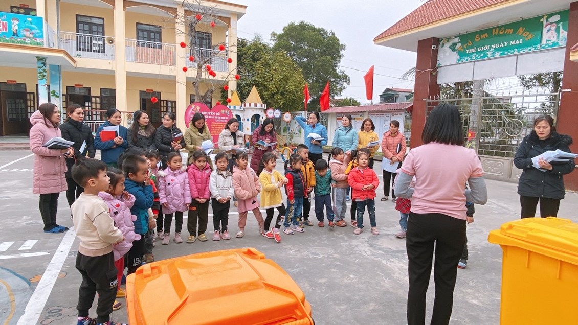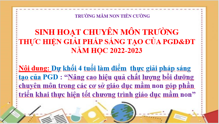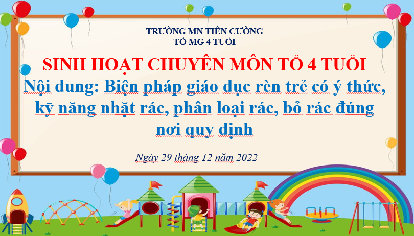 Ngày 28/12/2022, được sự nhất trí của ban giám hiệu nhà trường, sự tư vấn từ bộ phận chuyên môn khối 4 tuổi thực hiện làm điểm bồi dưỡng chuyên môn tổ với thực hiện Giải pháp sáng tạo của PGD với nội dung sau: “ Biện pháp giáo dục ý thức, nâng cao kỹ năng bỏ rác đúng nơi quy định cho trẻ trong trường mầm non” năm học 2022-2023 với các hình thức: