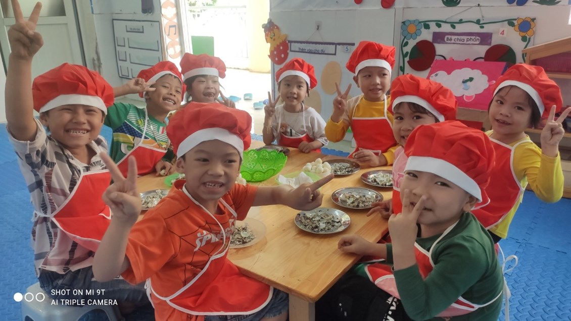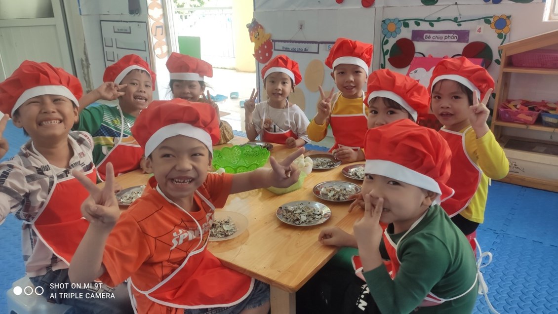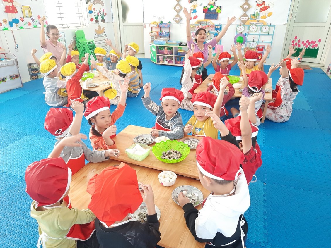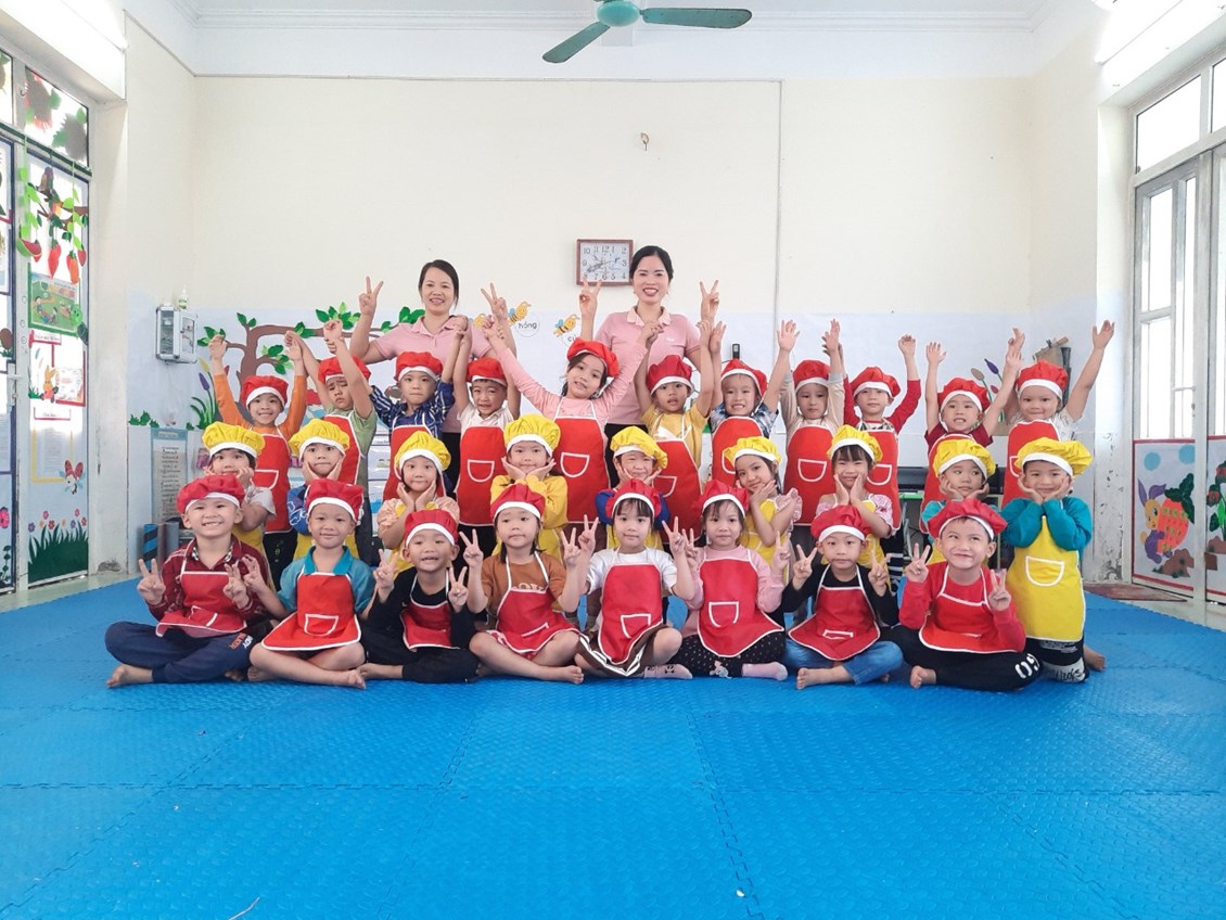 Thực hiện nhiệm vụ năm học 2022-2023 và triển khai thực hiện giải pháp sáng tạo của nhà trường "Sáng tạo trong thiết kế thực đơn, nâng cao chất lượng bữa ăn, kết hợp tăng cường vận động cho trẻ trong trường mầm non". Nhà trường đã xây dựng thực đơn theo mùa theo tháng và tuần để chế biến thật nhiều món ăn ngon, giàu giá trị dinh dưỡng hấp dẫn kích thích trẻ ăn ngon miệng hết xuất.