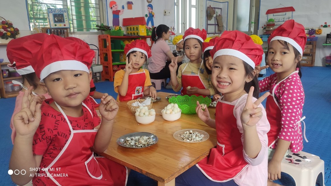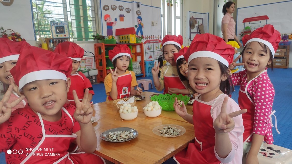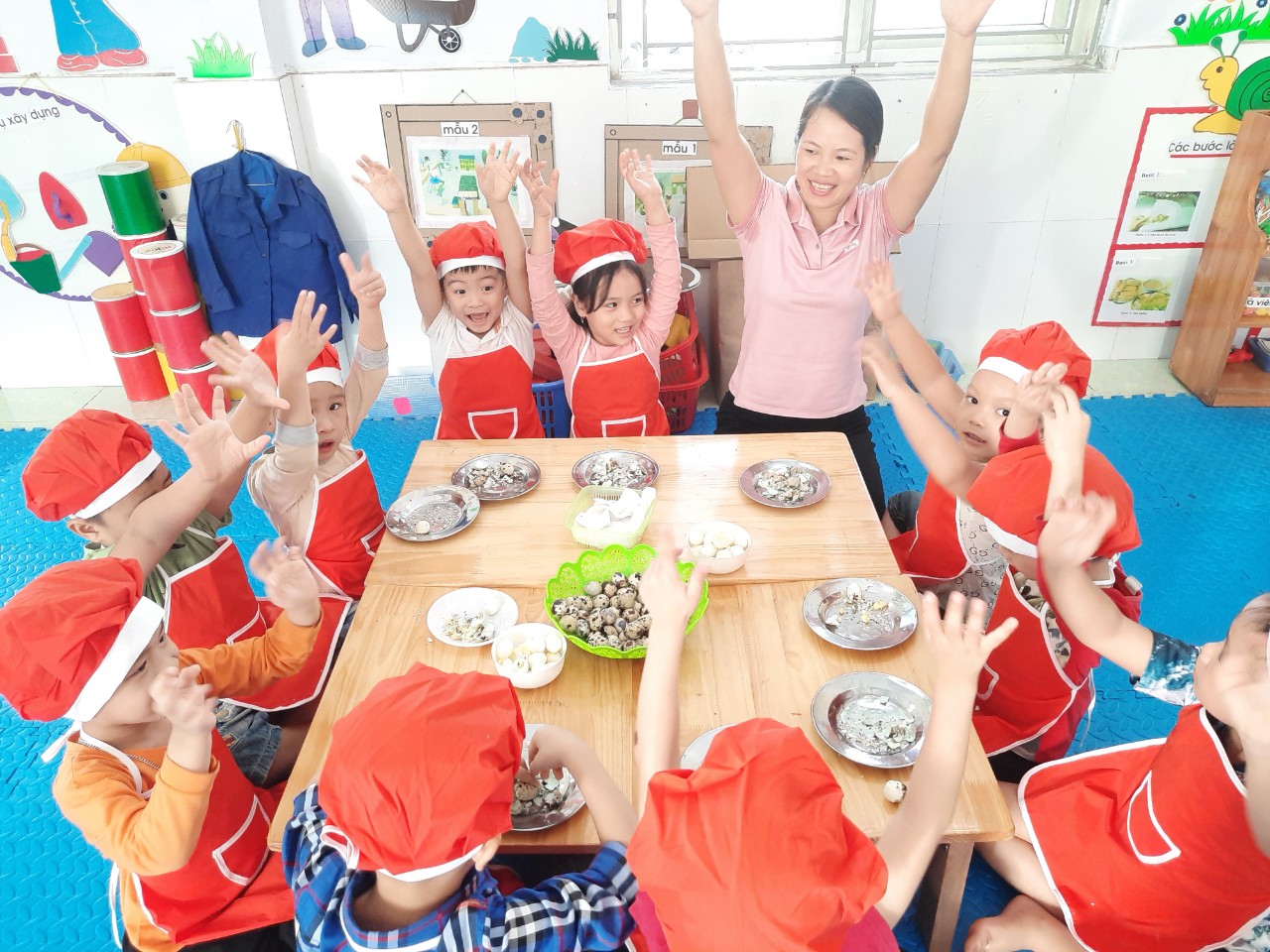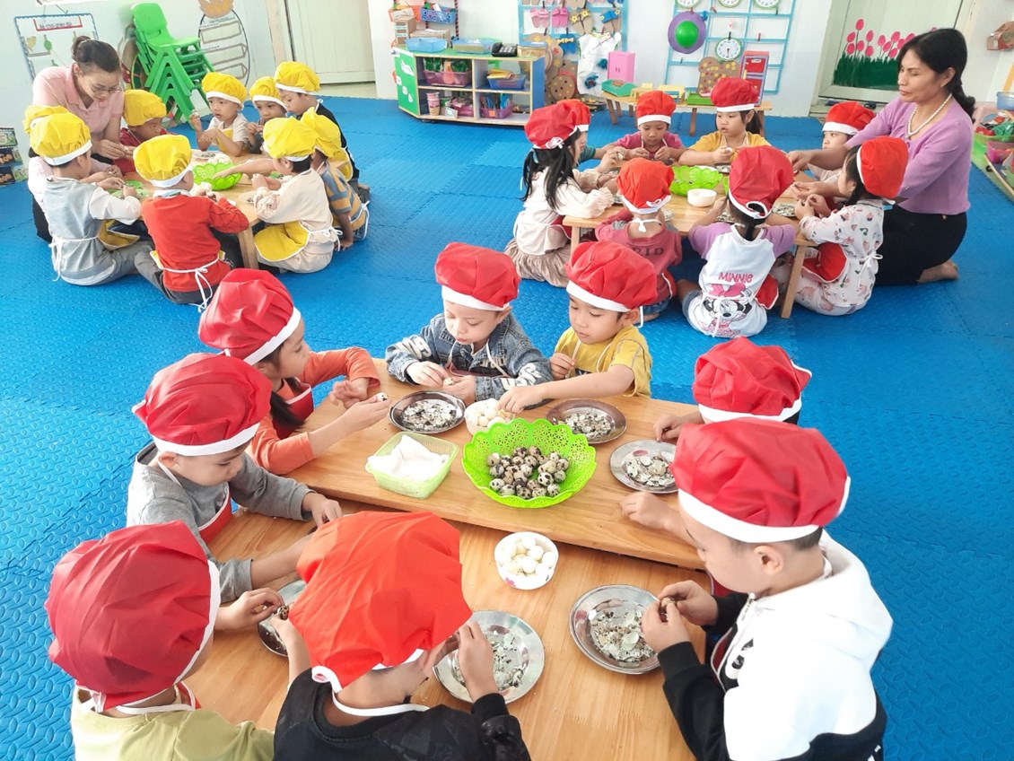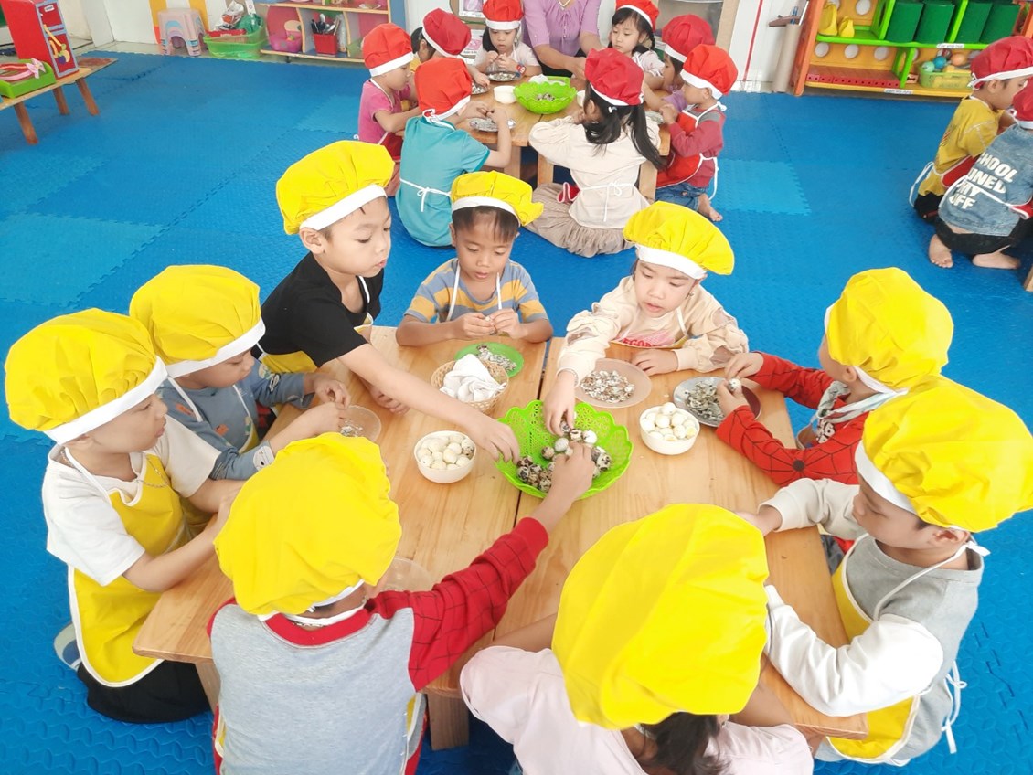 Nằm trong chuỗi hoạt động thực hiện giải pháp sáng tạo, chuyên đề lấy trẻ làm trung tâm với mục đích tăng cường trải nghiệm, phát triển kĩ năng xã hội cho trẻ. Hôm nay các bé 5 tuổi đã được tham gia hoạt động bóc trứng cút. Một hoạt động tưởng chừng dễ ràng với người lớn nhưng với nhiều trẻ còn vô cùng bỡ ngỡ. Vì có nhiều bé khi ở nhà chưa từng được trải nghiệm.