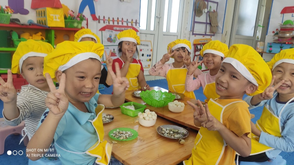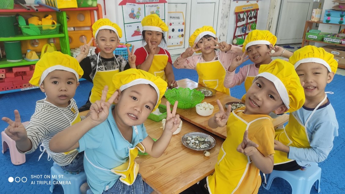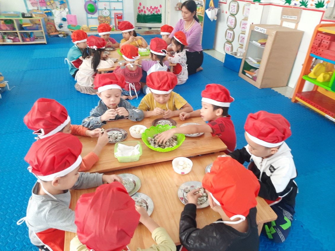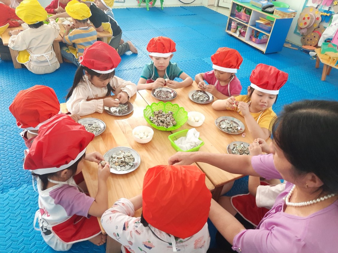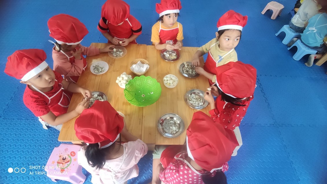 Nằm trong chuỗi hoạt động thực hiện giải pháp sáng tạo, chuyên đề lấy trẻ làm trung tâm với mục đích tăng cường trải nghiệm, phát triển kĩ năng xã hội cho trẻ. Hôm nay các bé 5 tuổi đã được tham gia hoạt động bóc trứng cút. Một hoạt động tưởng chừng dễ ràng với người lớn nhưng với nhiều trẻ còn vô cùng bỡ ngỡ. Vì có nhiều bé khi ở nhà chưa từng được trải nghiệm.