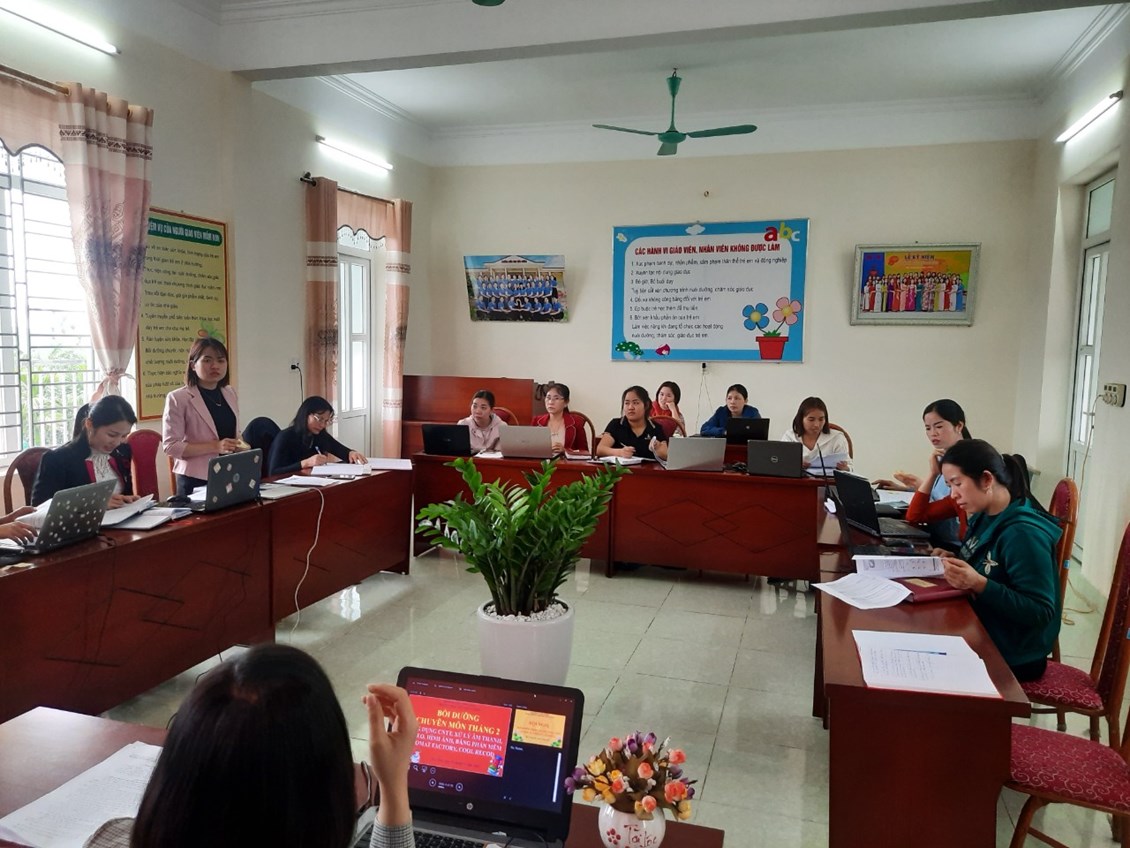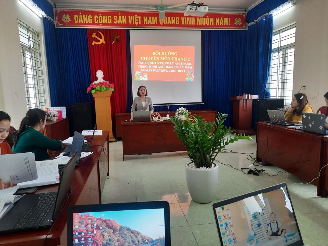 Về dự với buổi sinh hoạt chuyên môn có đồng chí Vũ Thị Xuyến-Bí thư chi bộ hiệu trưởng nhà trường, các đồng chí trong BGH, giáo viên các khối tuổi. Đ/c Xuyến đã phát biểu nhấn mạnh về tầm quan trọng của việc nâng cao kỹ năng ứng dụng CNTT, đặc biệt trong thời đại công nghệ 4.0.