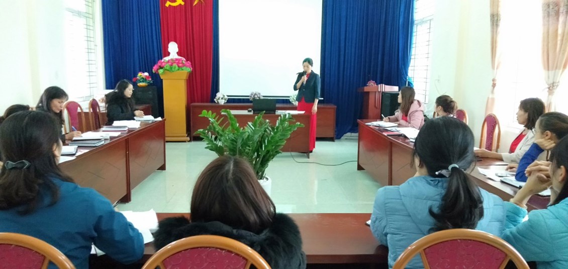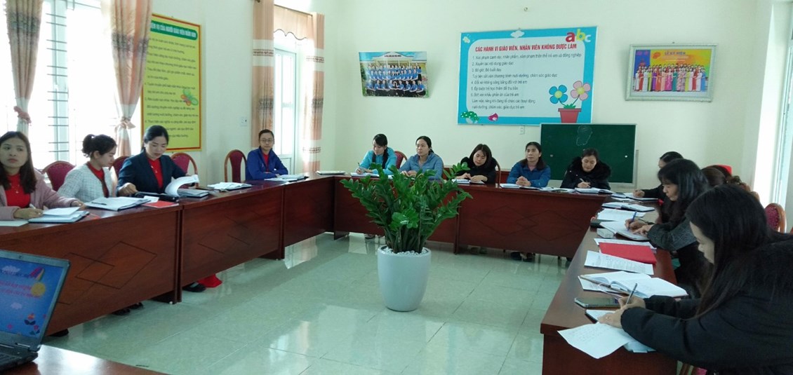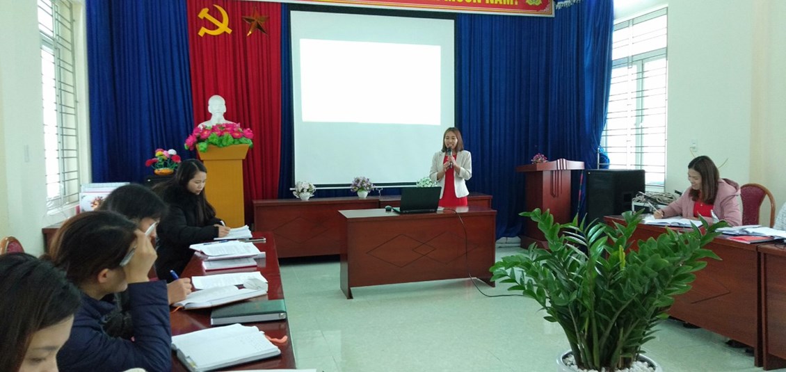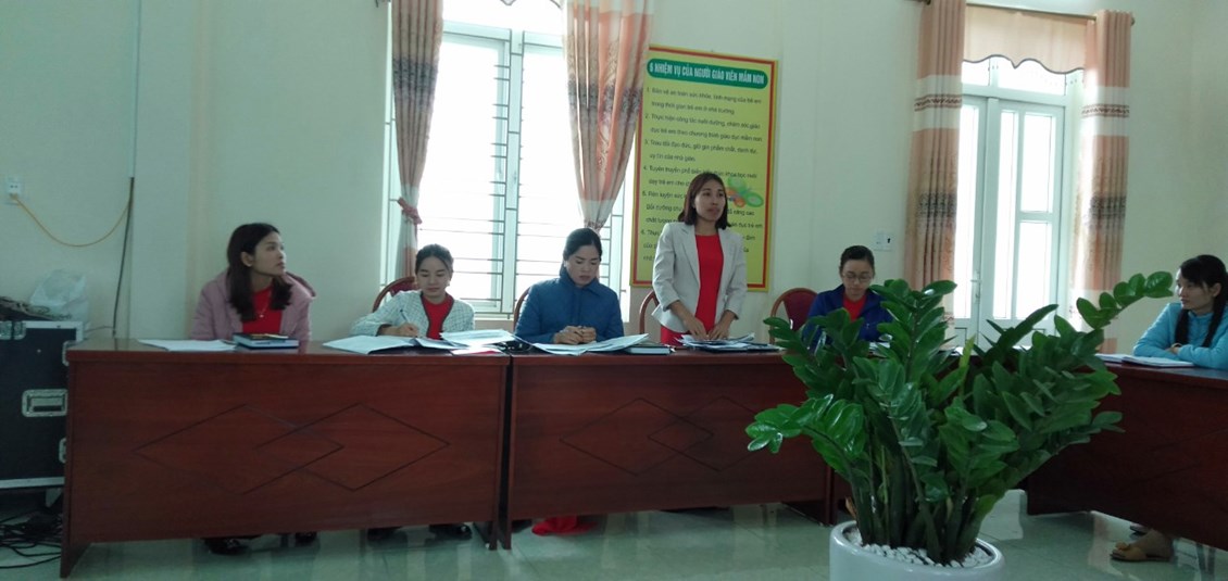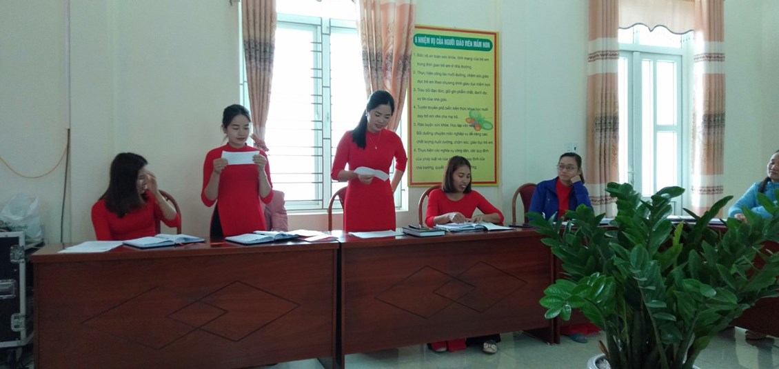 Mở đầu buổi sinh hoạt đồng chí Hà tuyên bố lí do giới thiệu đại biểu, và cho các thành viên trong tổ bốc thăm các lá thăm về các nội dung thực hành như: tập dẫn chương trình Mc của ngày 8/3- đồng chí Chu Thị Ninh và Lê Thị Kim Liên, Thuyết trình một ý tưởng sáng tạo đồng chí Trần Thị Liên, thuyết trình bài tuyên truyền với phụ huynh về ích lợi của việc đưa trẻ đến trường...