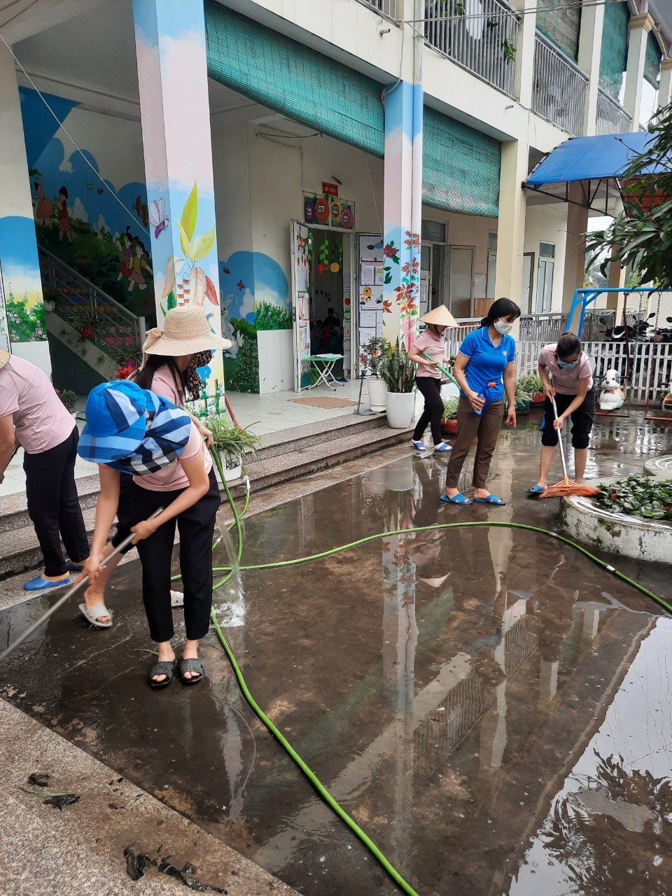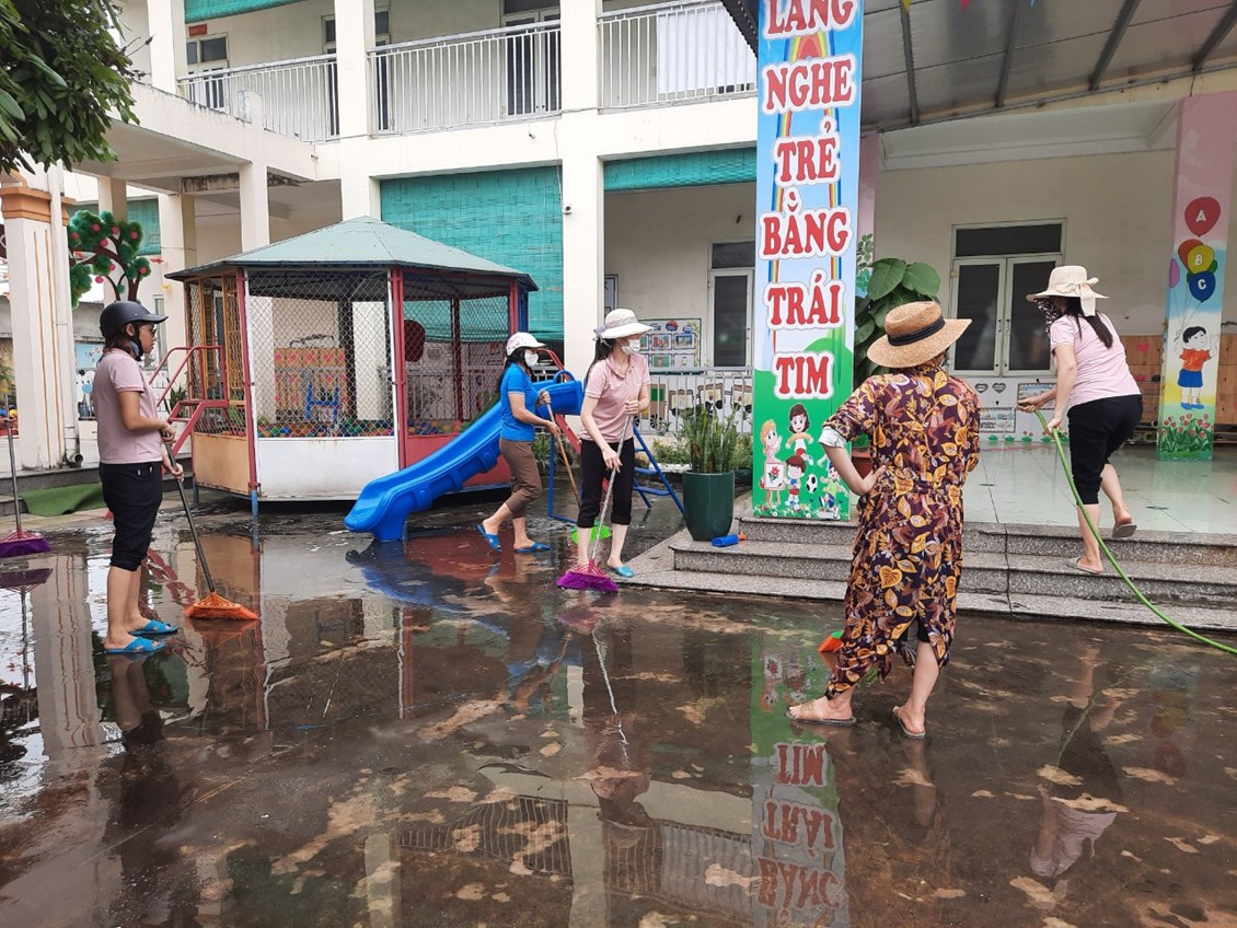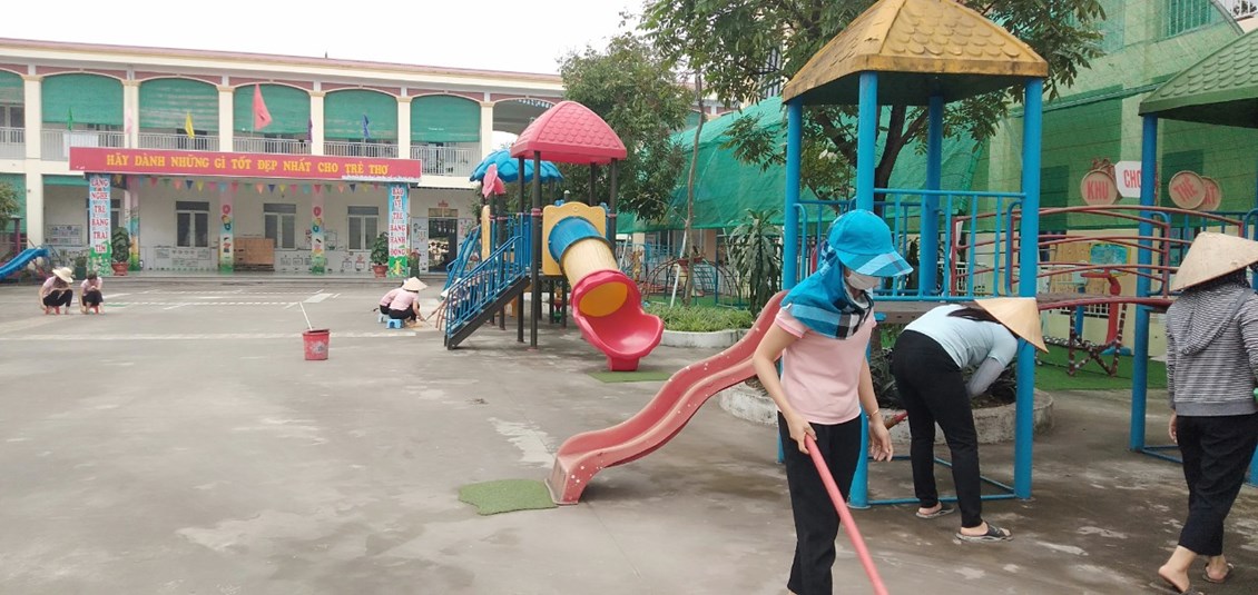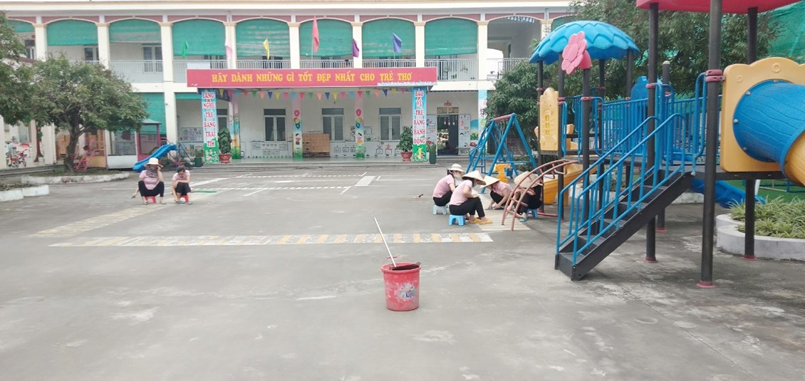 Nhận thức được tầm quan trọng của công tác vệ sinh phòng bệnh, sáng cùng ngày BGH, CBGV-NV đã tiến hành tổng vệ sinh toàn trường, rửa toàn bộ sân, đồ chơi ngoài trời. Bên cạnh đó nhà trường tiến hành thông tin tuyên truyền tới CBGV-NV và các bậc phụ huynh về diễn biến mới của dịch bệnh để có biện pháp phối hợ tốt nhất ngăn ngừa dịch bệnh Covid-19 và các bệnh dịch khác diễn ra trong nhà trường