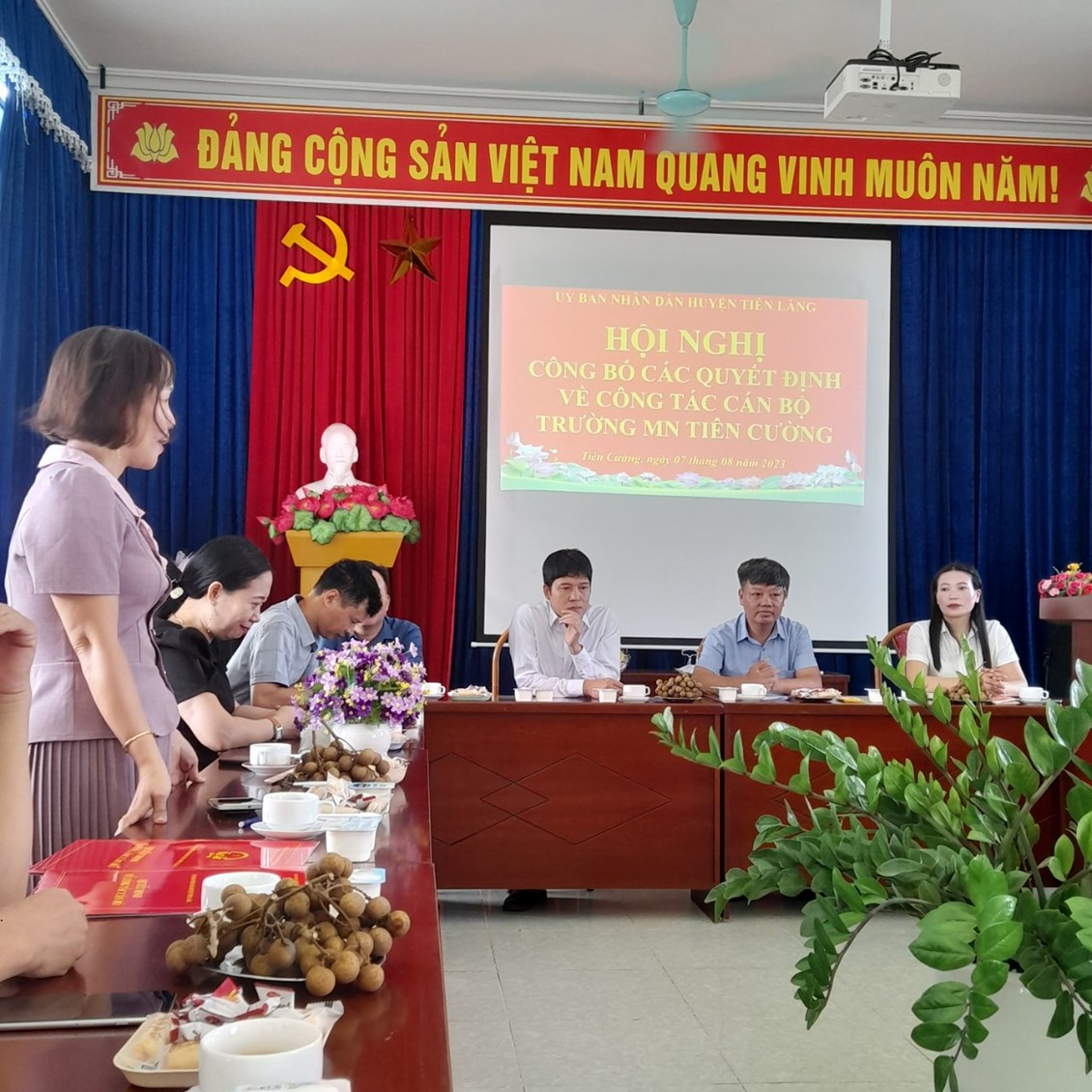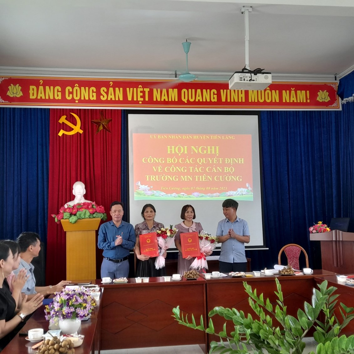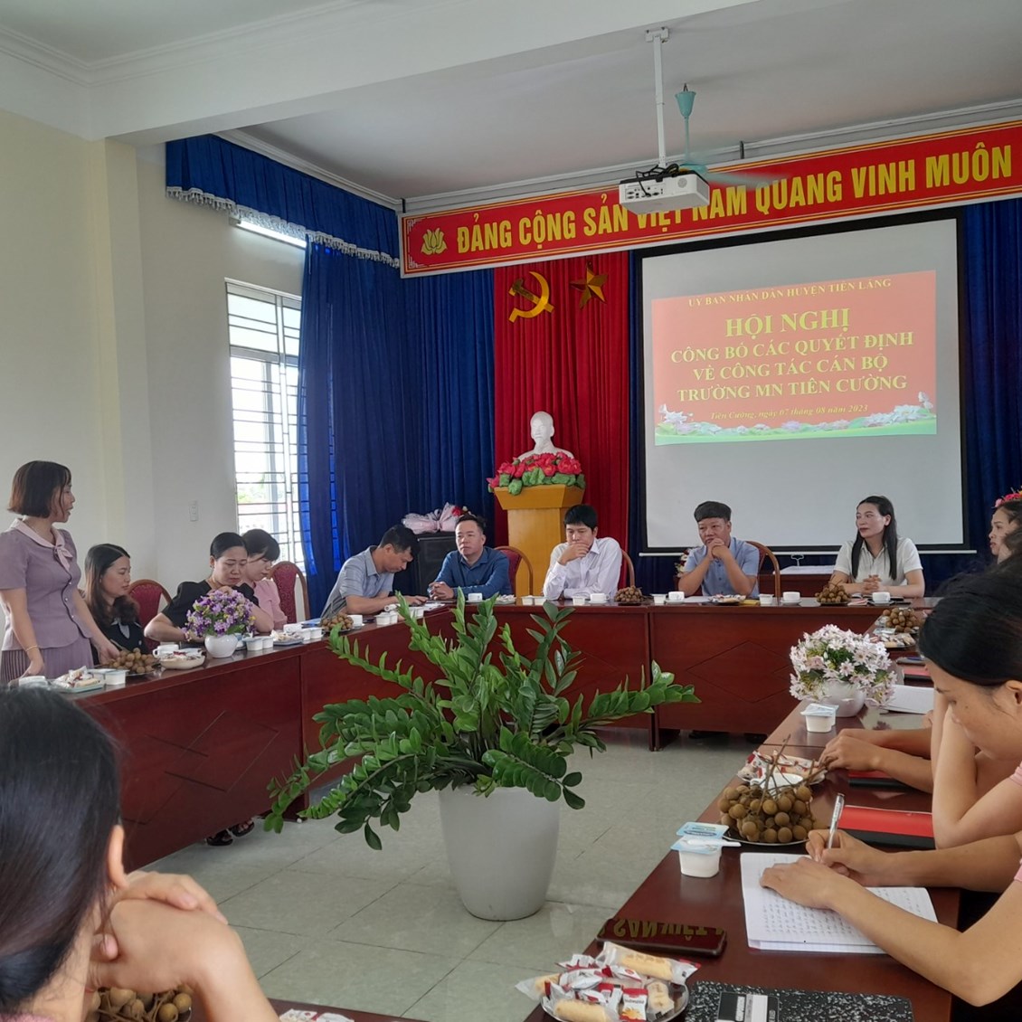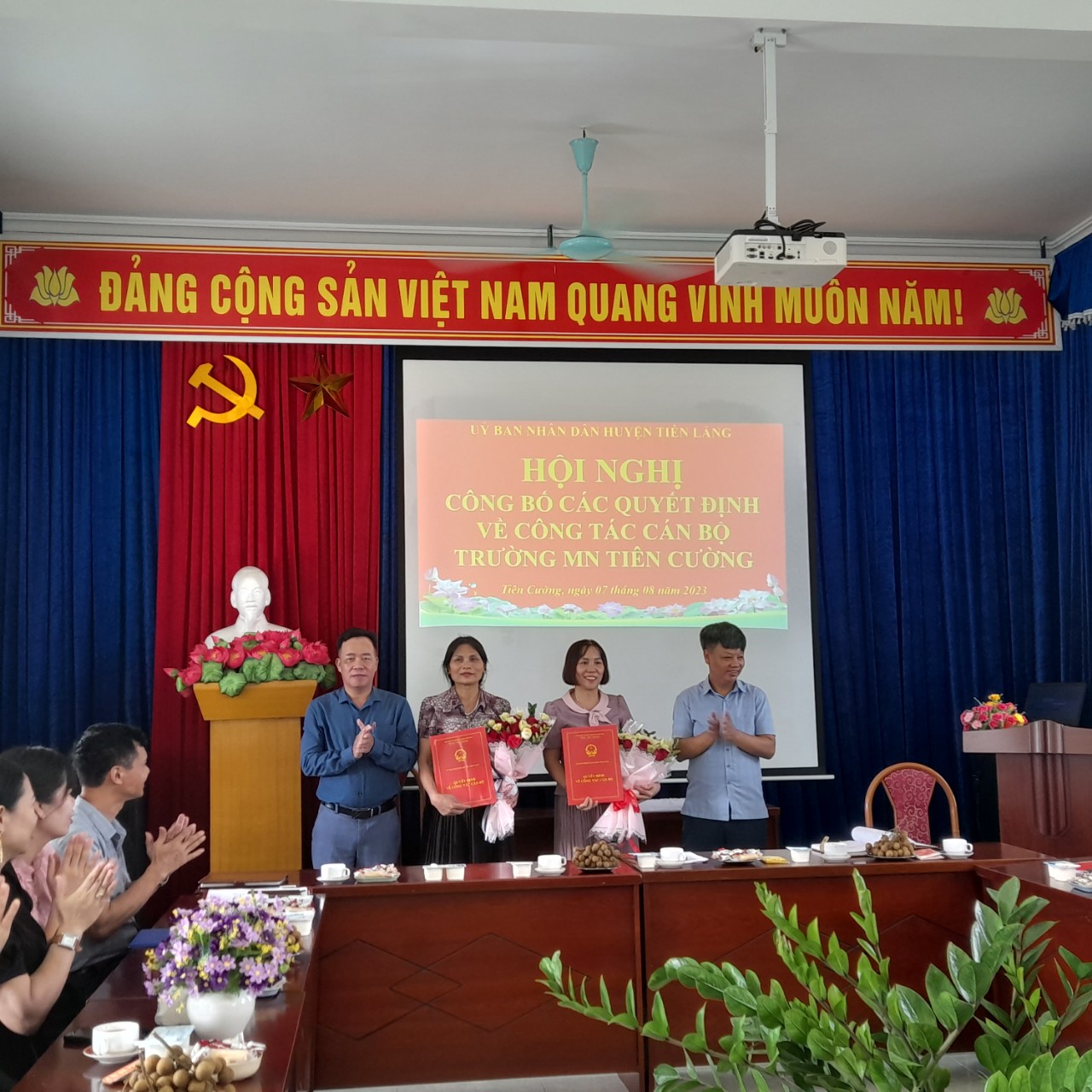 Ngày 07/08/2023 tại Hội trường Trường mầm non Tiên Cường đã diễn ra Hội nghị công bố các quyết định về công tác cán bộ Về dự và chỉ đạo Hội nghị có đồng chí Nguyễn Ngọc Huy-Phó Chủ tịch UBND huyện cùng các đồng chí đại diện cho các văn phòng HĐND, phòng nội vụ, Ban tổ chức Huyện ủy, Phòng GD&ĐT huyện. Hội nghị đã công bố quyết đinh đối với đồng chí Hoàng Thị Mai nguyên PHT Trường mầm non Tiên Cường luân chuyển lên Trường mầm non Đại Thắng giữ chức vụ PHT trường mầm non Đại Thắng. Hội nghị cũng công bố quyết định luân chuyển đồng chí Nguyễn Thị Đoan Trang-PHT trường mầm non Tự Cường về Trường mầm non Tiên Cường giữ chức vụ PHT.