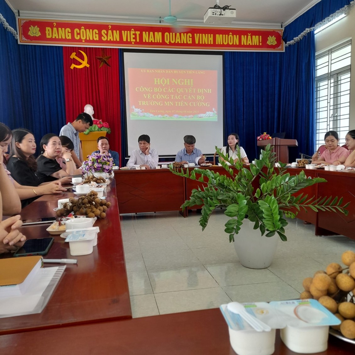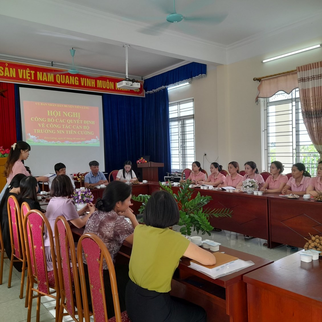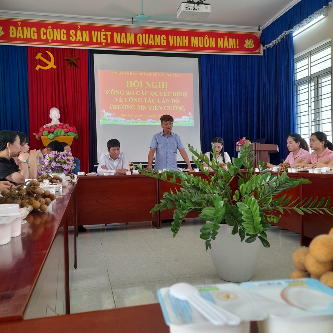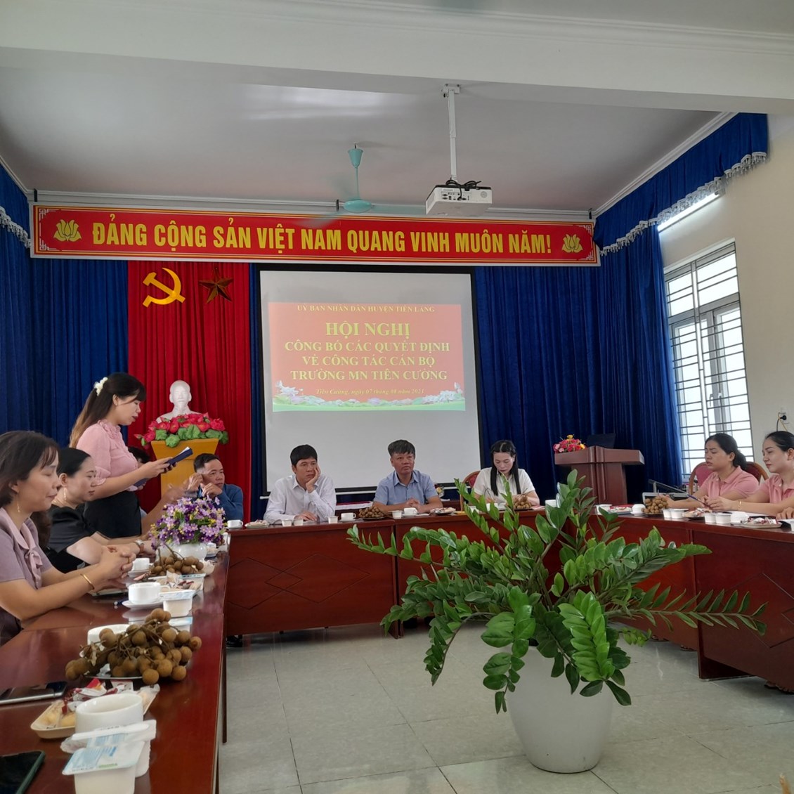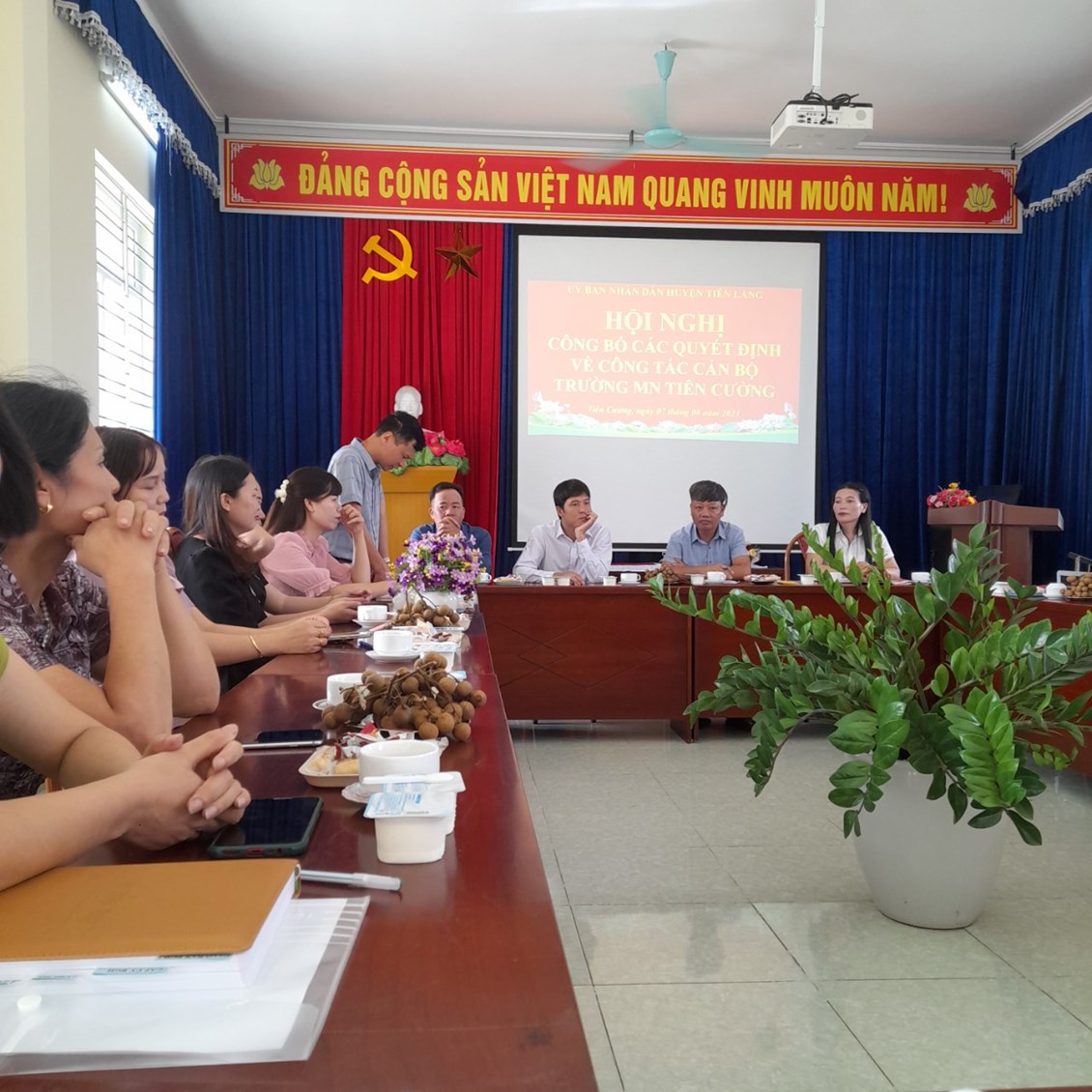 Ngày 07/08/2023 tại Hội trường Trường mầm non Tiên Cường đã diễn ra Hội nghị công bố các quyết định về công tác cán bộ Về dự và chỉ đạo Hội nghị có đồng chí Nguyễn Ngọc Huy-Phó Chủ tịch UBND huyện cùng các đồng chí đại diện cho các văn phòng HĐND, phòng nội vụ, Ban tổ chức Huyện ủy, Phòng GD&ĐT huyện. Hội nghị đã công bố quyết đinh đối với đồng chí Hoàng Thị Mai nguyên PHT Trường mầm non Tiên Cường luân chuyển lên Trường mầm non Đại Thắng giữ chức vụ PHT trường mầm non Đại Thắng. Hội nghị cũng công bố quyết định luân chuyển đồng chí Nguyễn Thị Đoan Trang-PHT trường mầm non Tự Cường về Trường mầm non Tiên Cường giữ chức vụ PHT.
